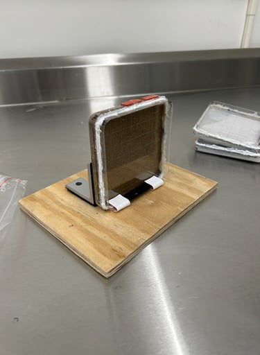 The design features a sealed, gridded Petri dish filled with regolith simulants, into which water is pumped via needled syringe. This flattened, disk-like geometry was needed to constrain the water droplet’s expansion to two dimensions, enabling clearer observation and analysis, as diffusion is expected to approach spherical symmetry in reduced gravity.